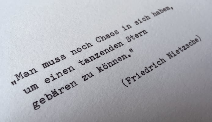 Nun steht also ein Stück Industriegeschichte auf unserem Bürotisch. Mit unserer "Adler" Zitate zu schreiben, folgt einem anderen Rhythmus, als das schnelle Tippen auf der Tastatur am Computer. Das merkten wir schnell. Jeder Buchstabe muss passen, kein copy & paste. Und einmal vertippt – kein delete. Es ist eine konzentrierte und achtsame Arbeit – und wahrscheinlich passt unsere Idee einer Renaissance der Schreibmaschine genau deshalb so gut in unsere heutige Zeit, weil sie sich bewusst deren Schnelllebigkeit entzieht. Hier lebt der Moment, in dem ein Unikat entsteht. In einer Welt, die viel Beliebigkeit produziert, schaffen wir etwas Besonderes.